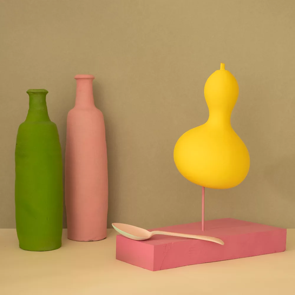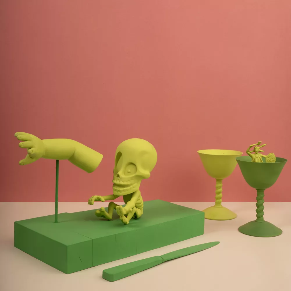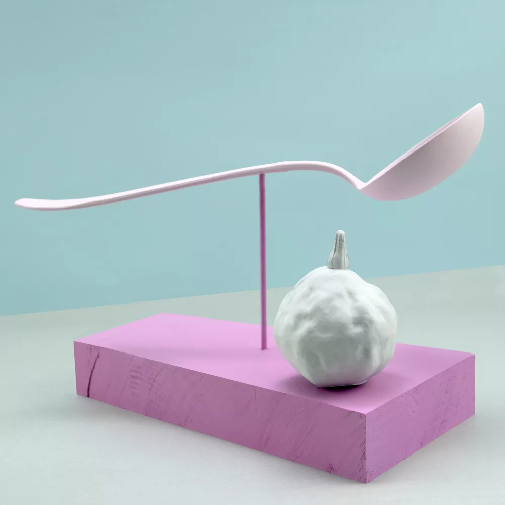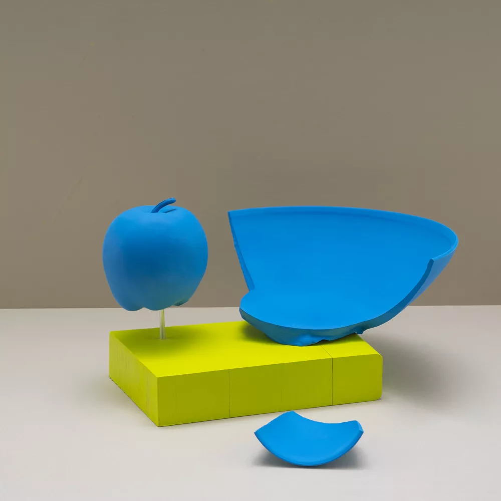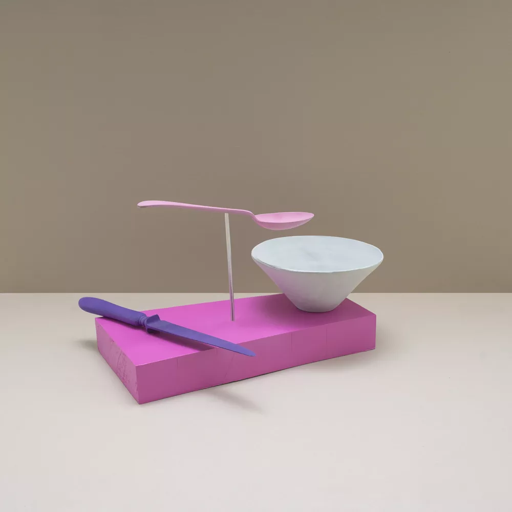 Ici, le travail de la couleur sur ces objets et de la lumière présente permet de les déplacer de leur contexte afin de permettre l’ouverture d’espaces nouveaux. Ces objets, peints puis photographiés, deviennent des jeux d’exercice visuel : une discipline du regard dans un contexte contraint.