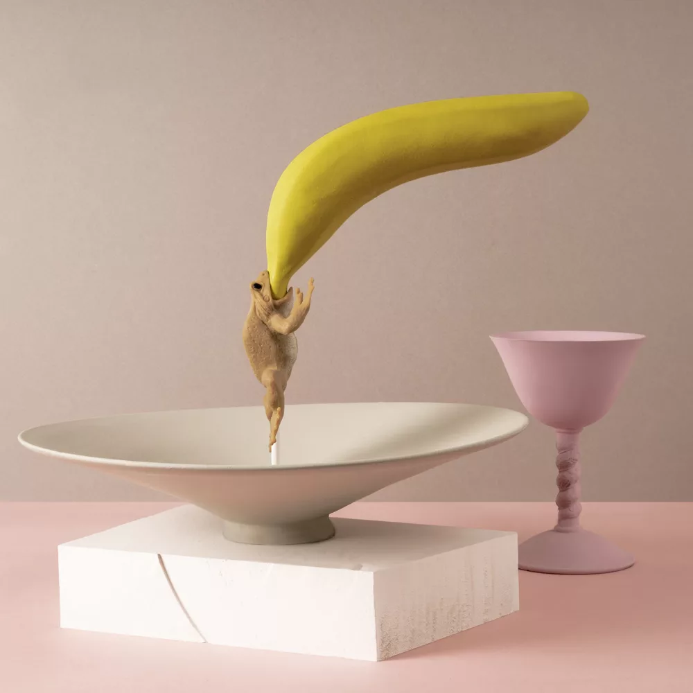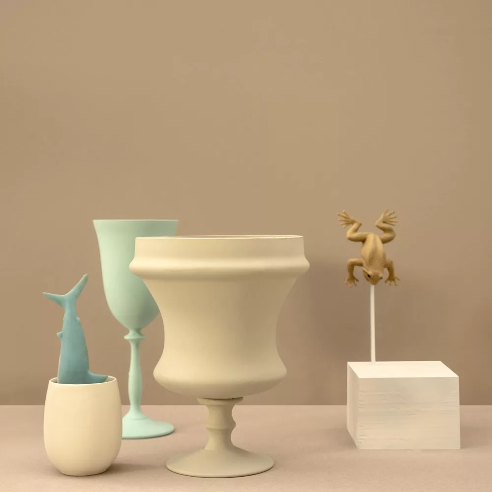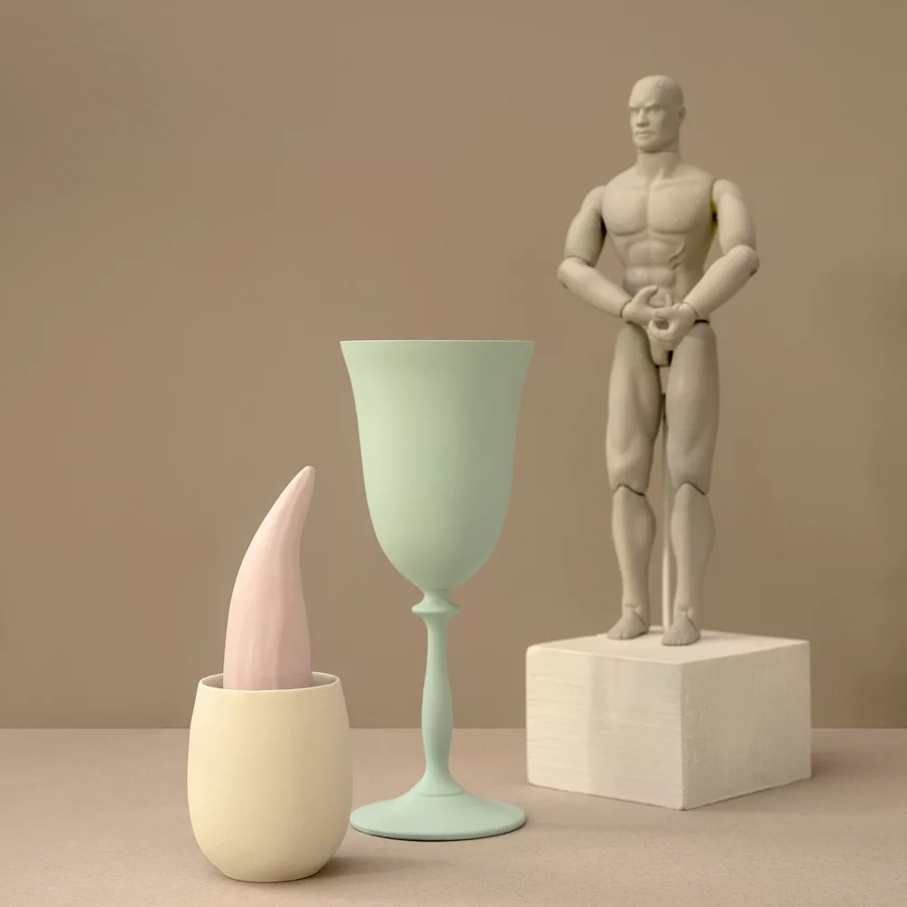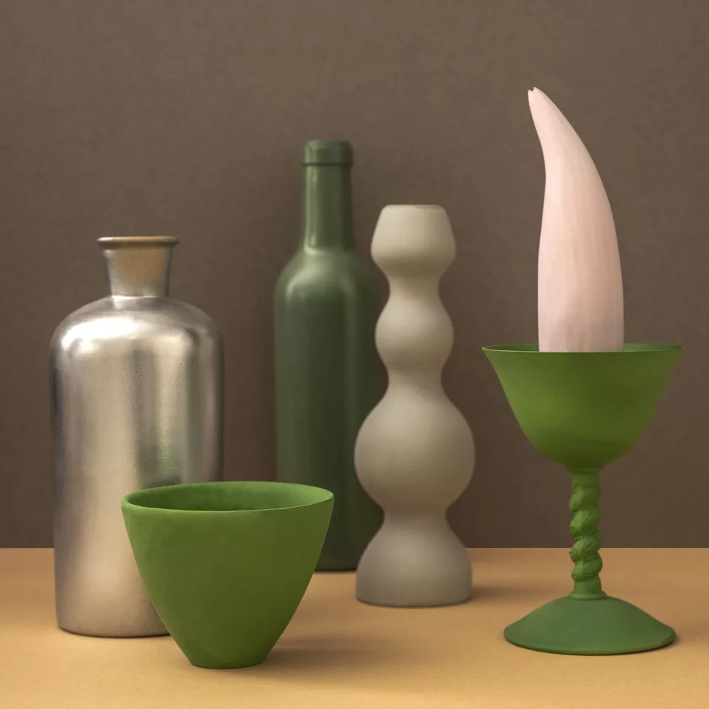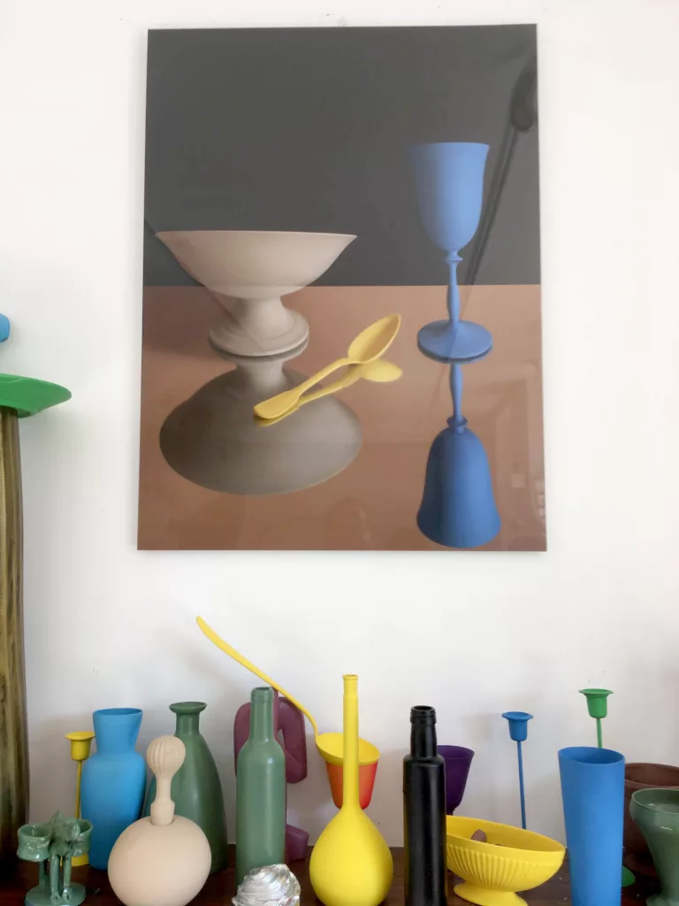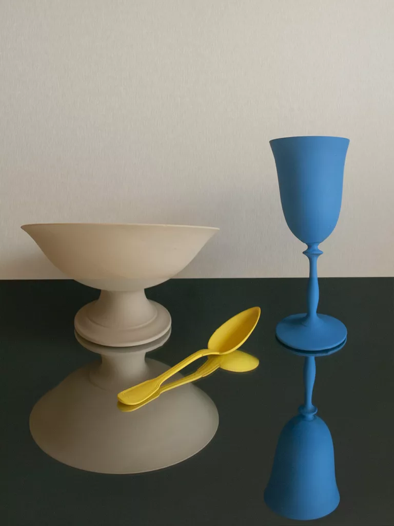 Ici, le travail de la couleur sur ces objets et de la lumière présente permet de les déplacer de leur contexte afin de permettre l’ouverture d’espaces nouveaux. Ces objets, peints puis photographiés, deviennent des jeux d’exercice visuel : une discipline du regard dans un contexte contraint.